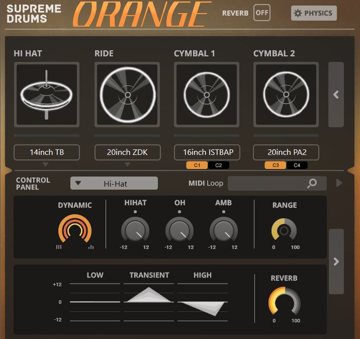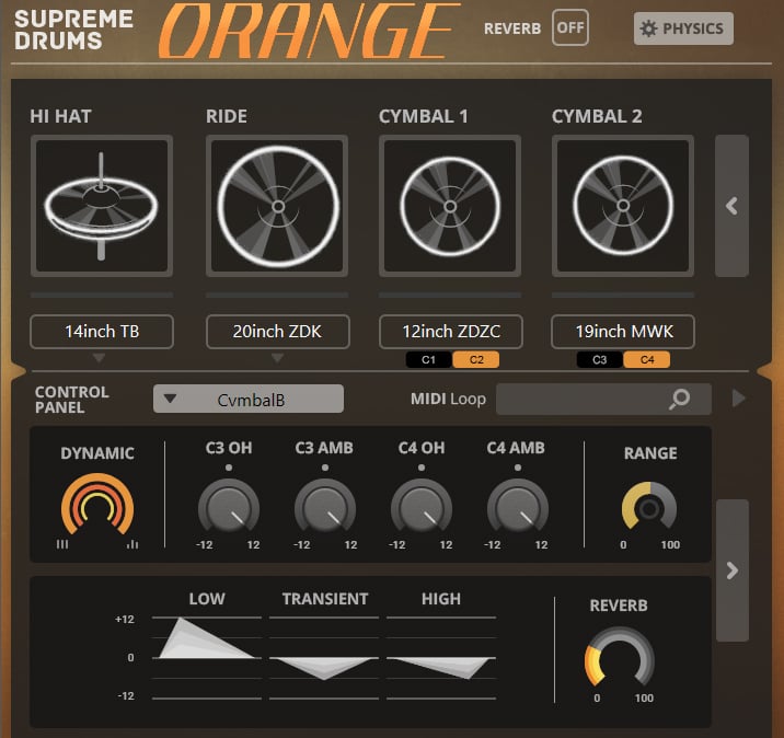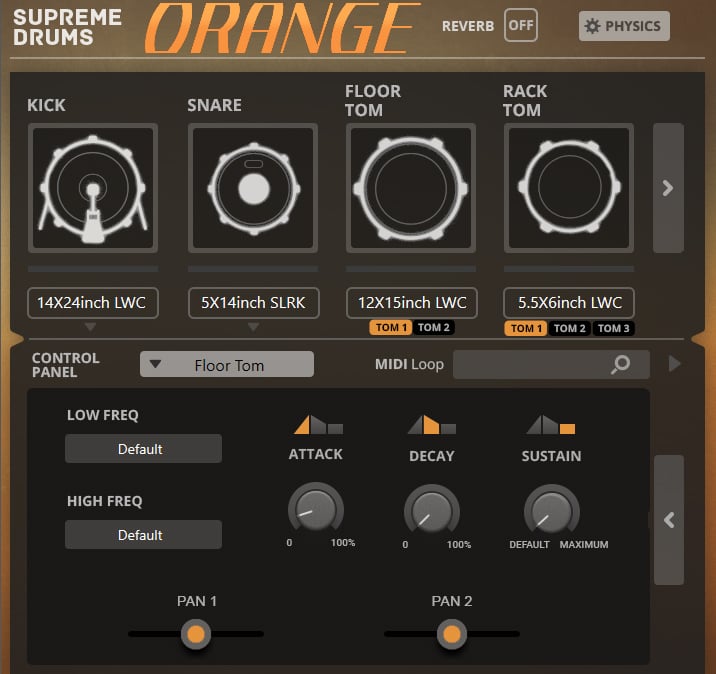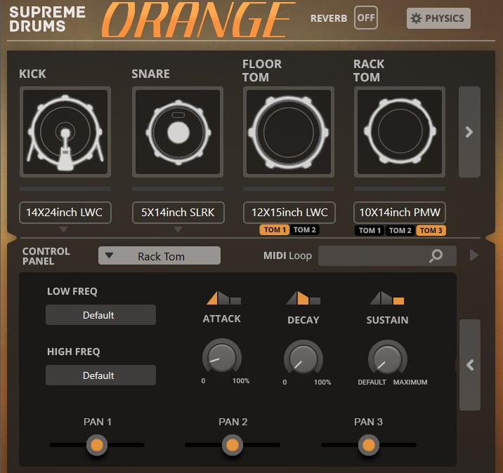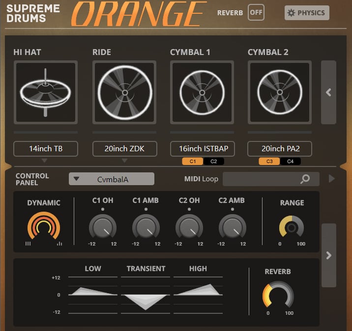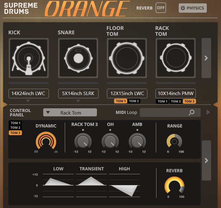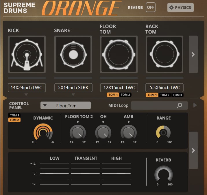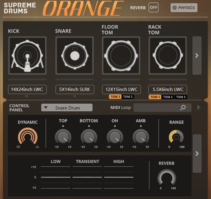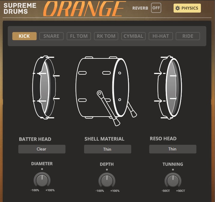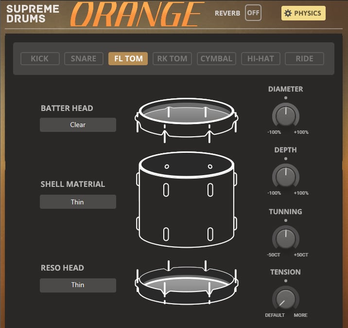 Unlike conventional sample libraries, modeling provides exceptional playability and flexibility. The new Physics section in Supreme Drums Orange allows users to: