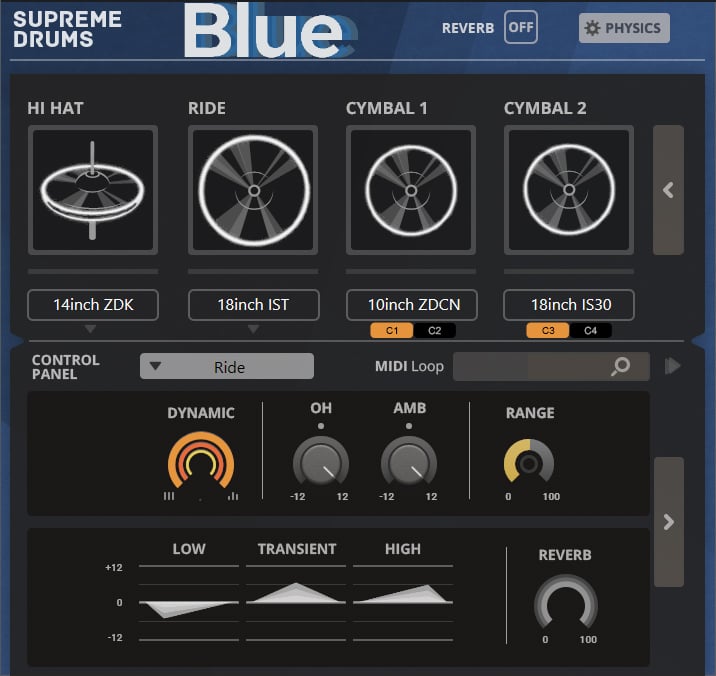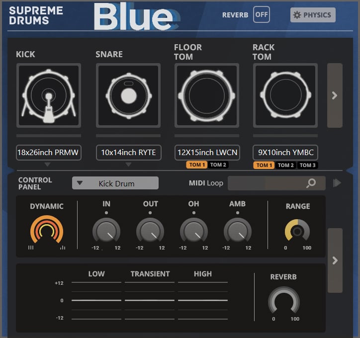 Unlike conventional sample libraries, modeling provides exceptional playability and flexibility. The new Physics section in Supreme Drums Blue allows users to:
